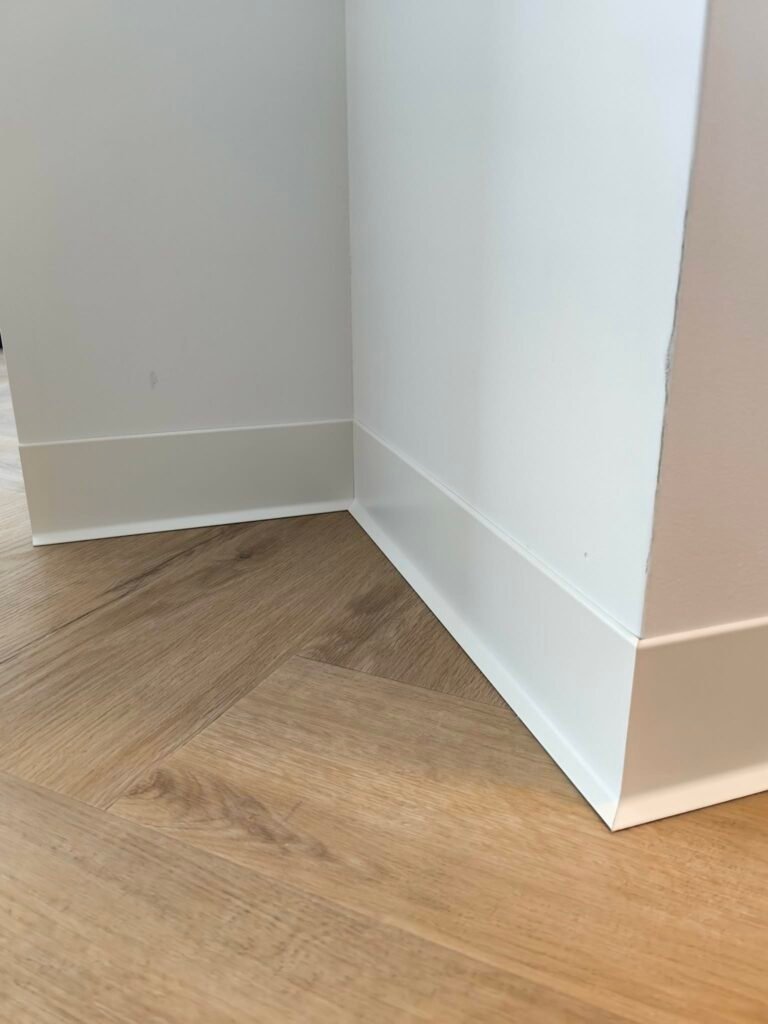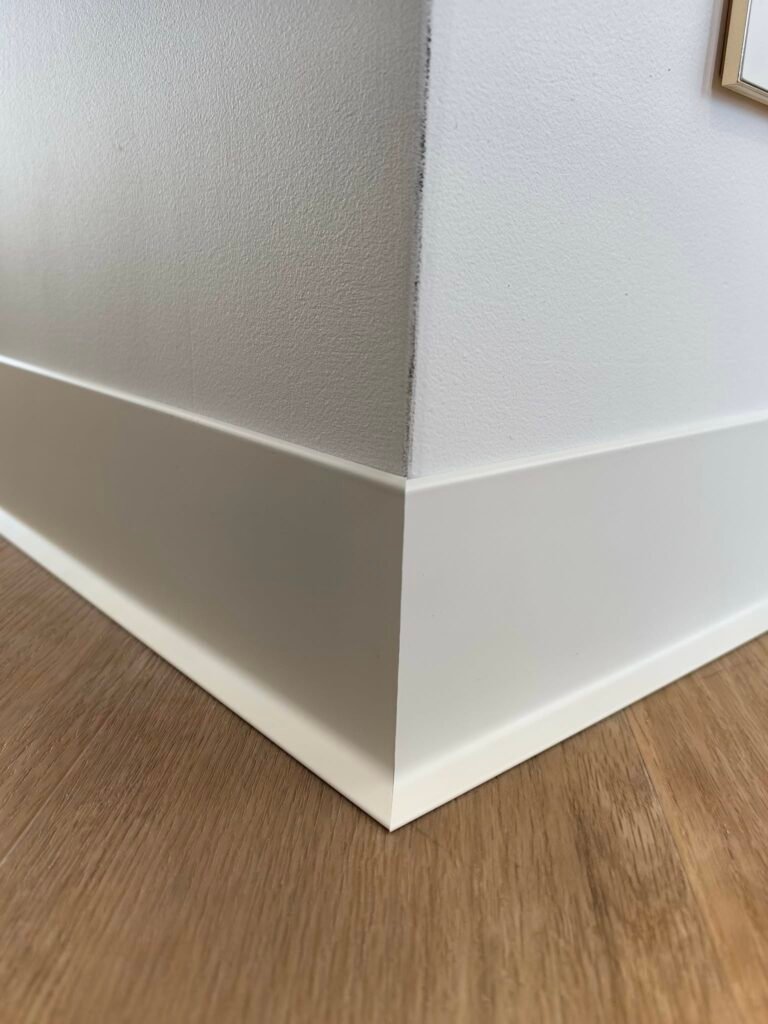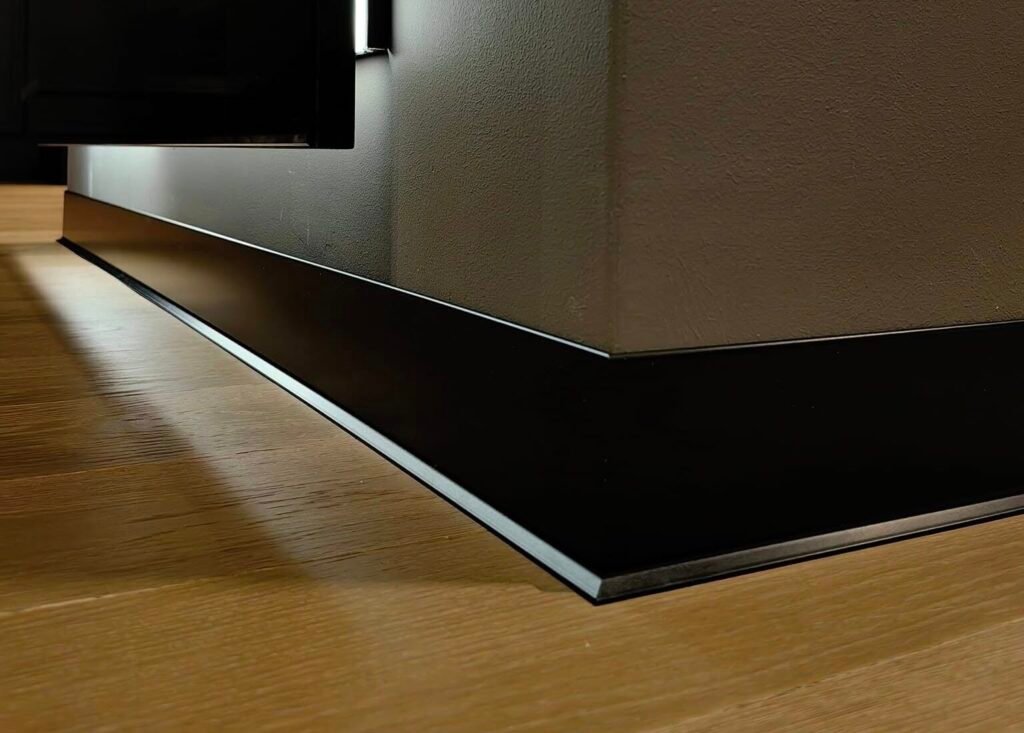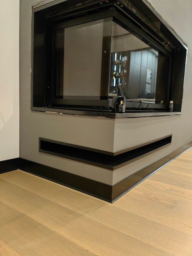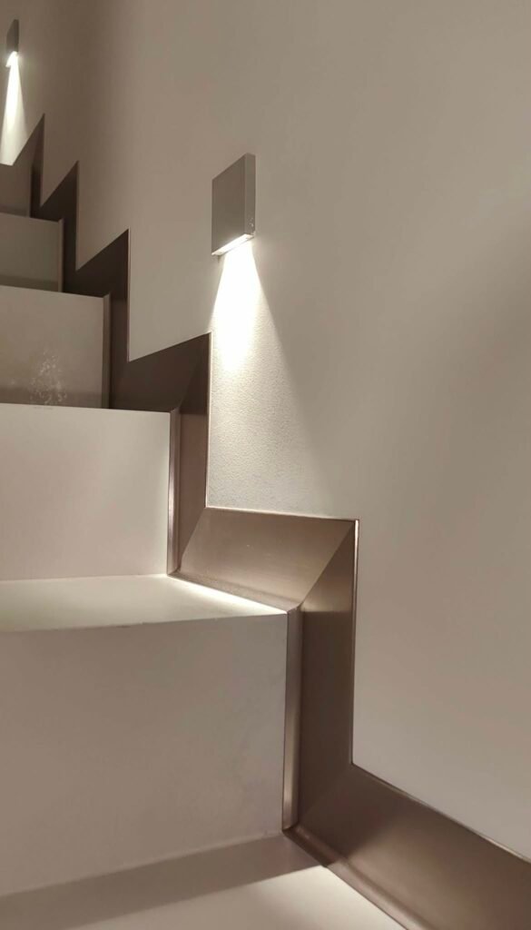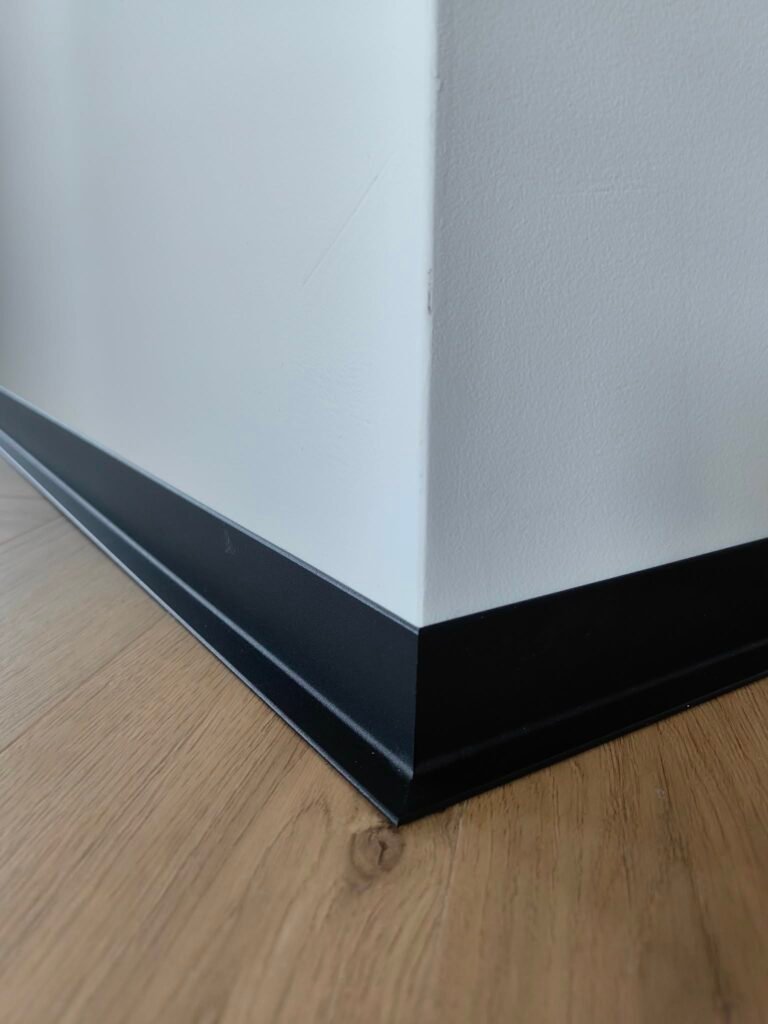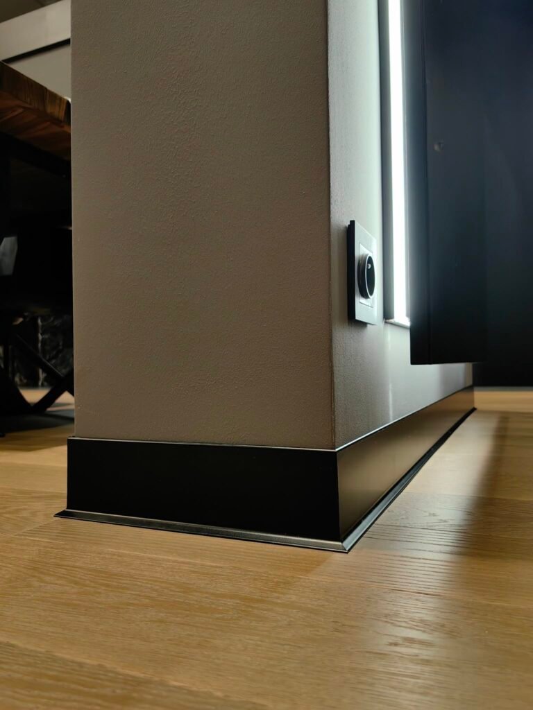 Perfekcyjne detale: Cięcie pod kątem 45° bez kompromisów W firmie Promonter wierzymy, że wysokiej klasy listwy aluminiowe wymagają równie wysokiej klasy montażu. Kluczowym elementem, który odróżnia amatorskie wykonanie od rzemieślniczej precyzji, jest sposób wykończenia narożników. Indywidualne podejście do każdego stopnia W teorii narożniki ścian mają 90°. W praktyce budowlanej idealne kąty niemal nie istnieją. Dlatego nasza technologia montażu opiera się na zasadzie „jeden narożnik – jeden pomiar”: Precyzyjna diagnostyka kątów: Nie tniemy „w ciemno”. Każdy narożnik mierzymy , aby poznać jego rzeczywistą wartość. Zaawansowane ukośnice: Pracujemy na specjalistycznym sprzęcie o najwyższej dokładności. Pozwala nam on na mikro-korektę ustawień tarczy, dzięki czemu cięcie jest idealnie dostosowane do krzywizny ściany. Dopasowanie co do milimetra: Jeśli ściana ucieka od pionu lub poziomu, my korygujemy kąt cięcia (np. na 44,8° lub 45,2°). Dzięki temu dwie listwy schodzą się w sposób hermetyczny, tworząc idealną, czystą linię bez konieczności stosowania maskownic czy wypełniaczy. Mistrzowska obróbka aluminium Aluminium to materiał, który nie wybacza błędów – raz wykonane cięcie musi być perfekcyjne. Dzięki zastosowaniu specjalistycznych tarcz o drobnym uzębieniu oraz autorskim technikom obróbki, krawędzie naszych listew są: Idealnie gładkie (bez poszarpań i odprysków), Symetryczne, Spasowane tak ciasno, że łączenie staje się niemal niewidoczne. Wybierając Promonter, inwestujesz w standard, w którym detal staje się ozdobą, a nie problemem technicznym. Nasze realizacje to dowód na to, że nawet najtrudniejszy narożnik może wyglądać estetycznie i nowocześnie. Poniżej przedstawiamy zdjęcia naszych realizacji, które najlepiej obrazują precyzję, o której mowa: